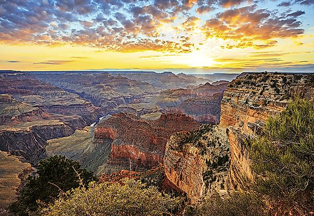 Grand Canyon at Sunset, Arizona, USA. Situated in Arizona, USA, the 277-mile long Grand Canyon is a truly awe-inspiring sight. The canyon, up to a mile deep and some 18 miles wide at its broadest, was forged by the unstoppable course of the Colorado River. Scientists estimate that the river first carved out its path more than 17 million years ago, exposing a wealth of information on the geological history of the region as it cut through the land. While in recent years increased safety measures have prevented visitors from approaching the edge of the canyon quite as closely they would like, the Grand Canyon site is still a popular tourist destination for anyone wishing to catch a glimpse of nature at its most powerful and majestic.